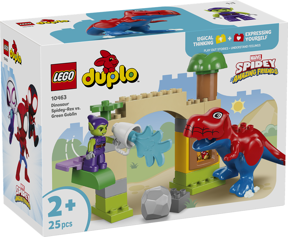 Gaven til drenge og piger fra 2 år er spækket med detaljer og funktioner til actionfyldt leg. Byggesættet omfatter to karakterer: et LEGO® DUPLO® byggelegetøj af Spidey T. rex, hvis mund kan åbnes og lukkes, og en LEGO® DUPLO® figur af Green Goblin på et flyvende fartøj. De mindste kan øve finmotorikken ved at samle buen og åbne døren til skatkammeret. Der er også en kampesten, som Spidey-Rex kan kaste mod fjenden med sin hale.