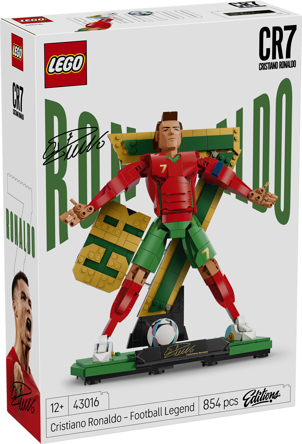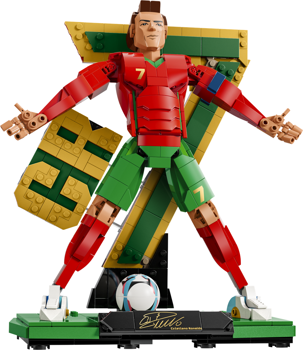 Børn kan forbyde sig i at bygge den yderst detaljerede Cristiano Ronaldo-udstillingsfigur og opdage 2 byggemuligheder for fodboldlegendens kropsstilling – midt i et saksespark, eller "Siuuu", hvor han lige har scoret et mål. Sættet indeholder e stor CR7-baggrund, en trykt signaturplade og et nyt fodboldelement. Figuren har også et nyt støbt ansigt, og når den er bygget færdig, bliver den til et fodbold-samlerobjekt, der spreder fanenergi i indretningen på værelset eller kontoret.