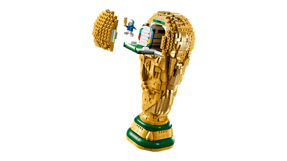 Fodboldstjerner fra 12 år kan have det sjovt med at bygge minimodellen af VM-pokalen med LEGO klodser og opdage dens autentiske detaljer. Modellens design omfatter motiver af 2 mennesker, der holder jordkloden over deres hoveder, og en plade med navne på tidligere VM-vindere i bunden. Globussen i toppen af LEGO pokalen kan åbnes for at afsløre en VM-minifigur, der holder en minipokal, og en baggrund med logo for FIFA VM 2026. Den lille model kan sættes ind i den store trofæmodel eller udstilles ved siden af.
