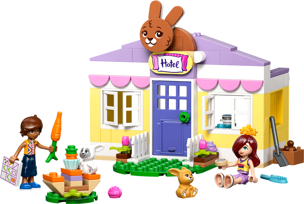 Det søde legesæt er fyldt med sjove detaljer, f.eks. en særlig lille dør til kaninerne og et sødt kaninskilt. Indenfor er der et gulerodsformet tæppe, et soveområde med kaninsenge samt en tjekliste til at tjekke kaninerne ind og ud af hotellet. Udenfor er der siddepladser, hvor kaninerne kan sidde sammen og spise en gulerods-cupcake. Tilbehøret inspirerer børn til at passe og pleje kæledyrene med en børste, garn, mad og vand samt en skovl til at samle kaninpøller op.