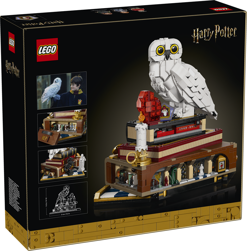 Skab den første LEGO Hedvig sneuglefigur med lukkede vinger, og udstil hende ved siden af De Vises Sten oven på Harry Potters kuffert. Tilføj 3 LEGO Harry Potter minifigurer – Harry Potter, Hermione Granger™ og™ Ron Weasley™ – og ting som et chokoladefrøkort og et troldmandsskakbræt.